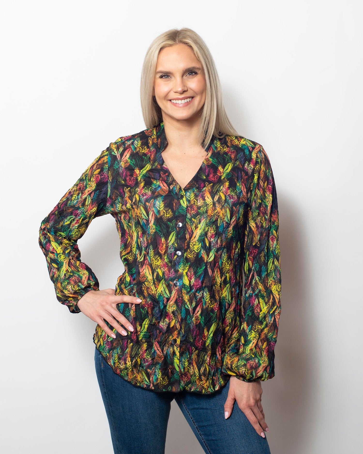 Expertly crafted with lightweight 100% polyester printed mesh, our Crinkle sweetheart button blouse is both stylish and comfortable. Machine washable and easy to care for, this blouse is perfect for any occasion and made in the USA with quality in mind.