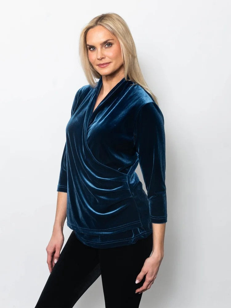 Expertly designed with lavish velvet material, this wrap top features 3/4-length sleeves and a surplice neckline.