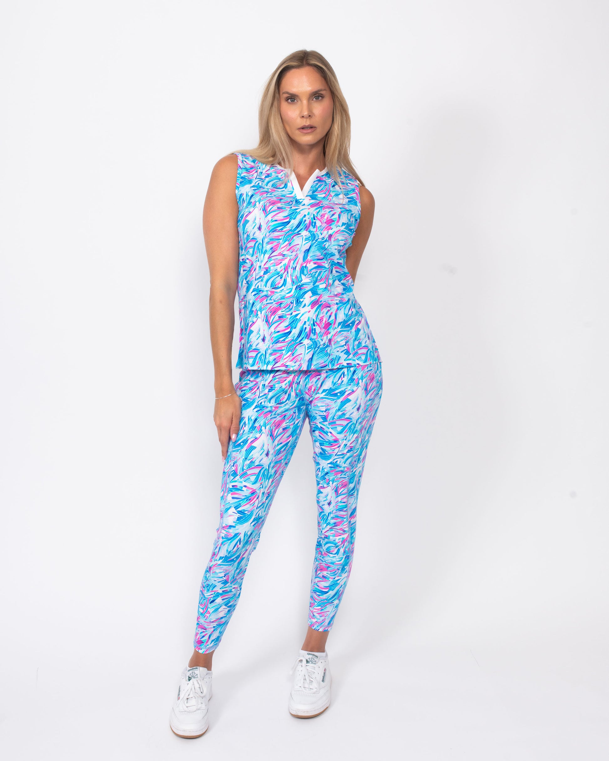 Great fit and beautiful pattern color. I can layer underneath it for golf or skiing with it still being a attractive fit to my body.